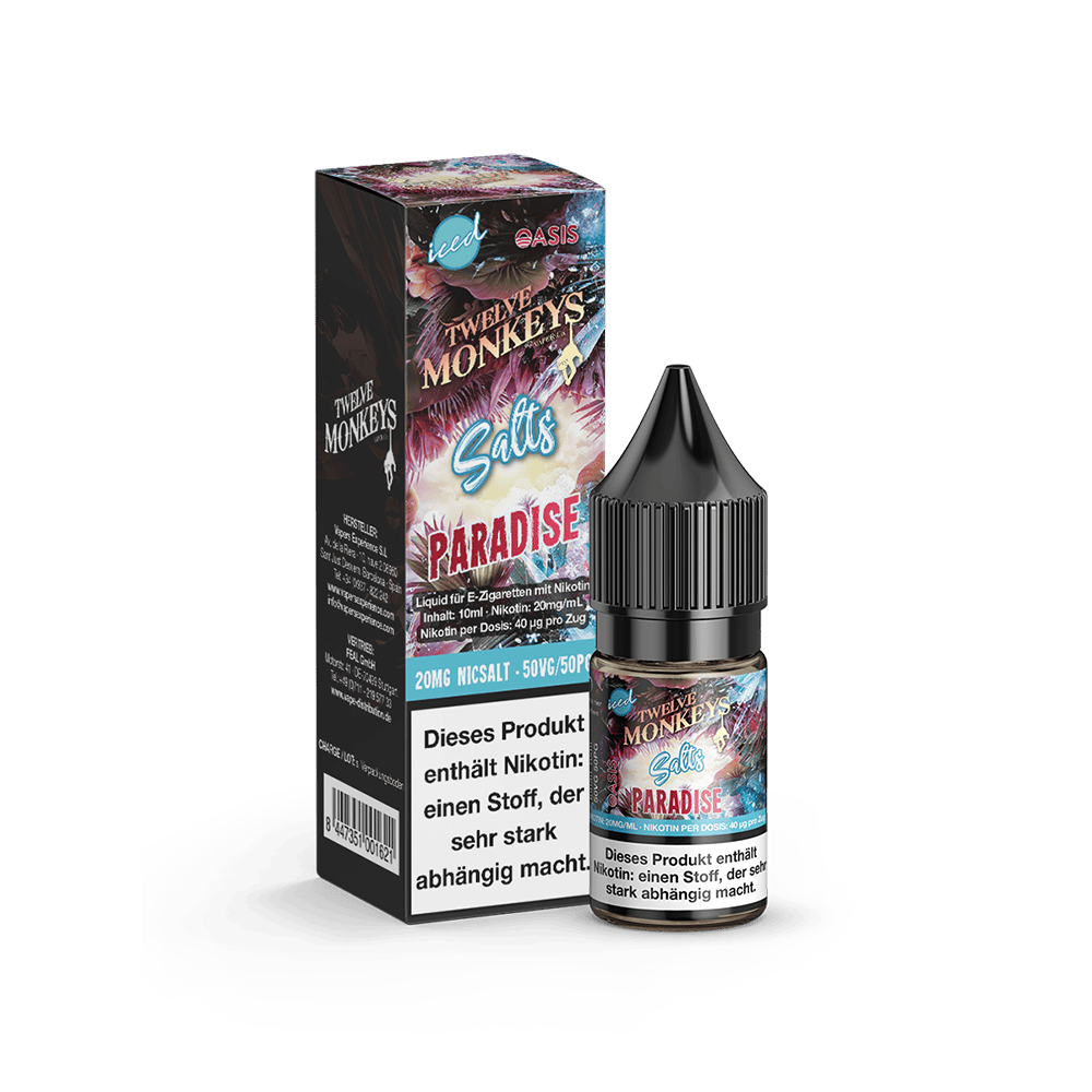 Erlebe eine tropische Geschmacksexplosion mit Twelve Monkeys Paradise Nikotinsalz Liquid – eine perfekte Kombination aus süßer Erdbeere, saftiger Ananas, cremiger Banane und exotischer Kokosnuss, abgerundet mit einer erfrischenden Kühle!